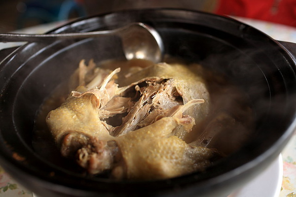招牌菜"燜鴨",鴨種為紅面番鴨,熱騰騰的鍋內 散發出濃濃的麻油香